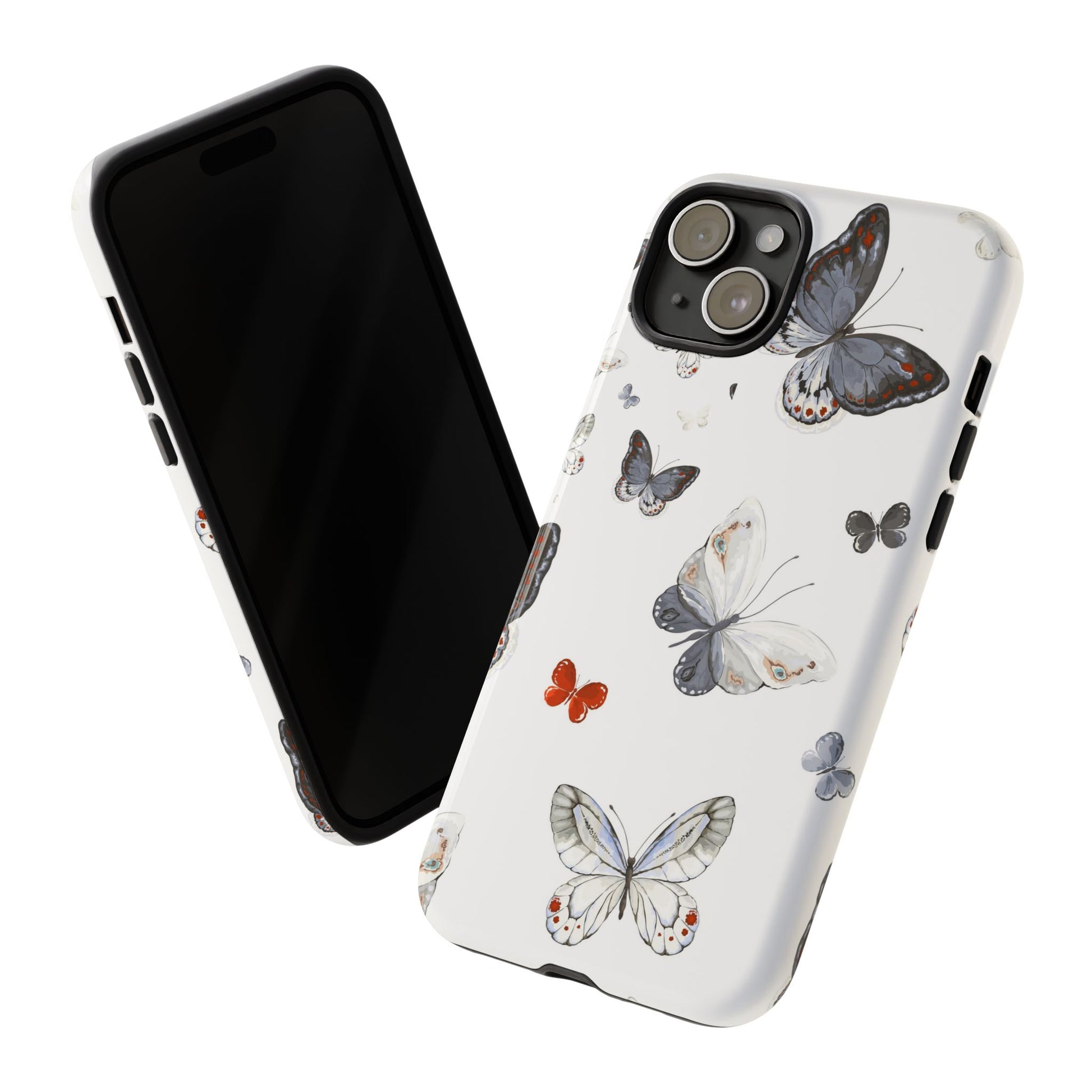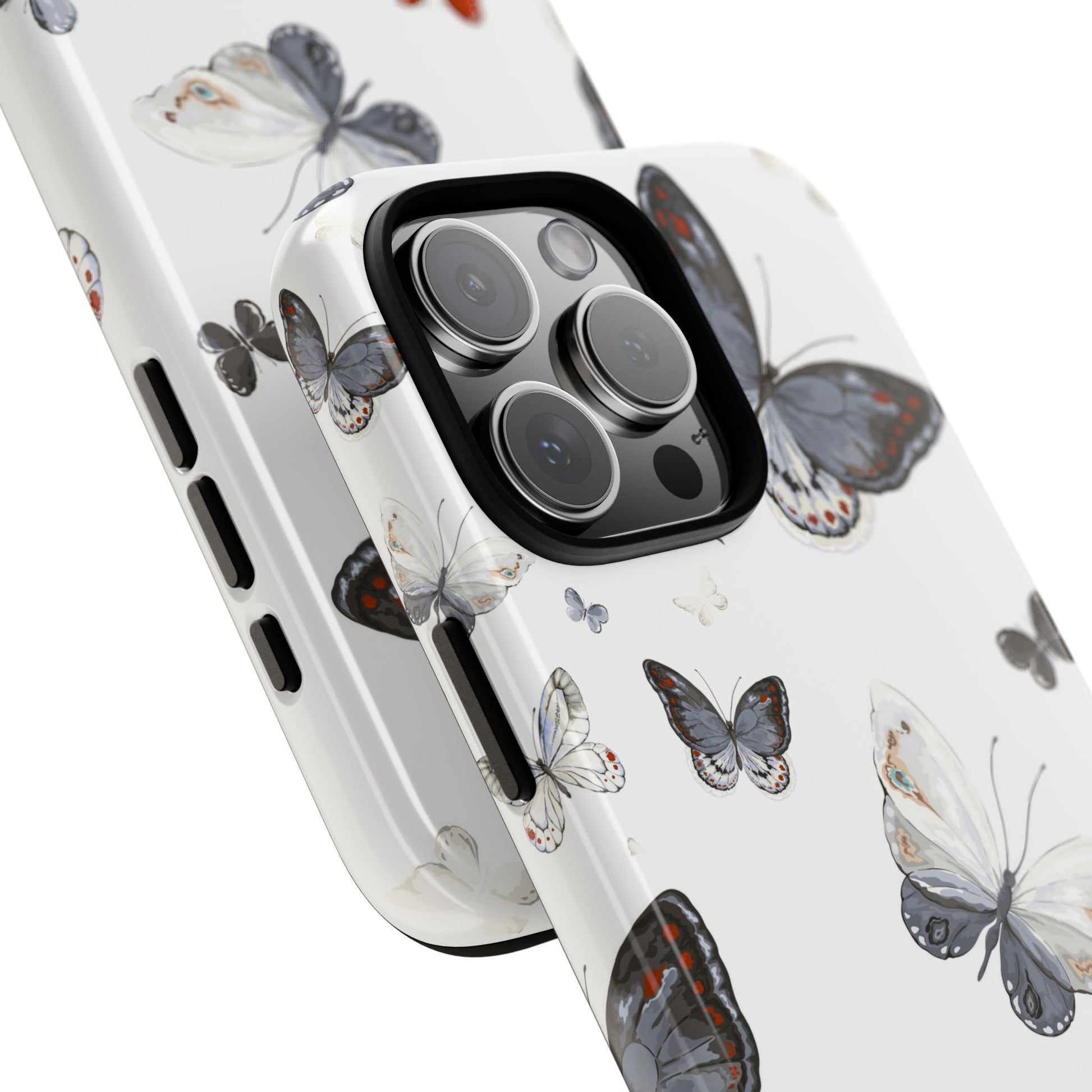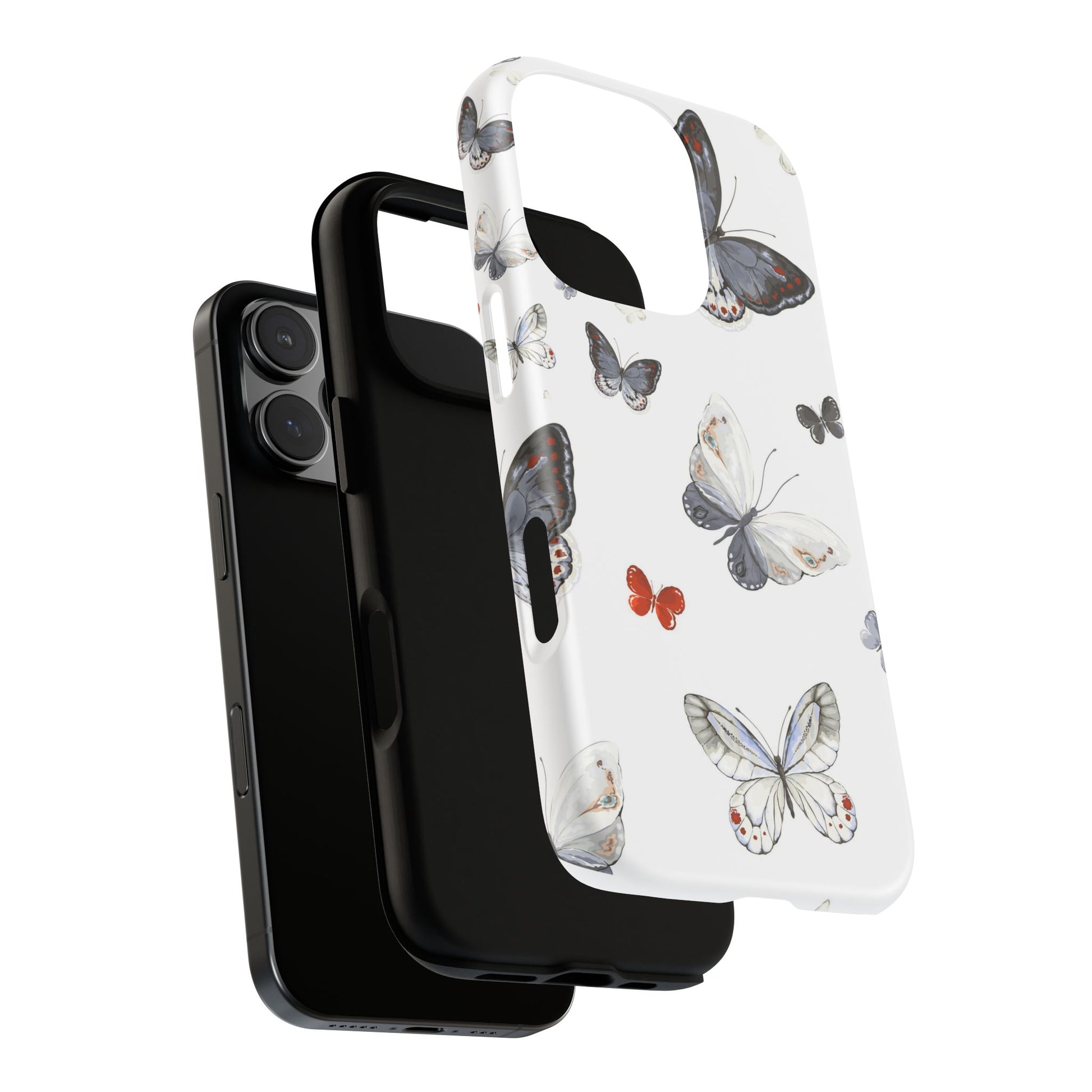 A slim, double-layer protective phone case printed with a delicate scattered-butterfly design. Soft grey, cream, and muted blue butterflies float across a clean white background while a single tiny orange butterfly adds a whisper of contrast. The outer shell is glossy (or matte) polycarbonate with a TPU silicone liner for shock absorption. The 3D wrap print flows around edges for a seamless look and UV-protection helps keep colors crisp outdoors. This case balances gentle, nature-inspired style with everyday impact resistance and clear port access — a quietly elegant way to keep a phone safe during daily adventures.