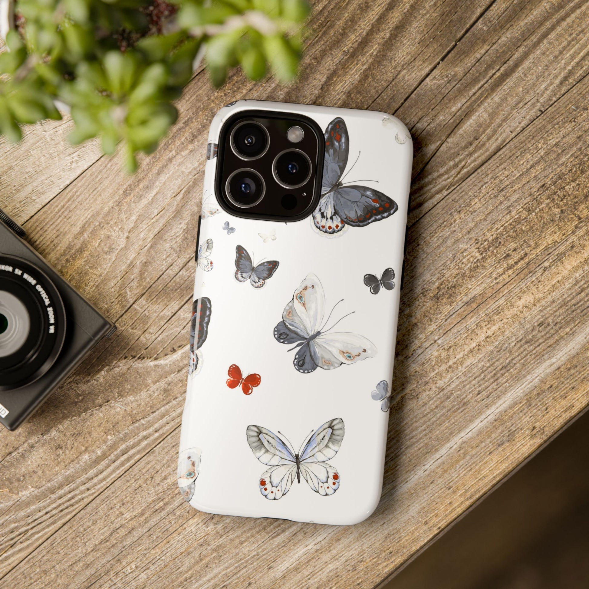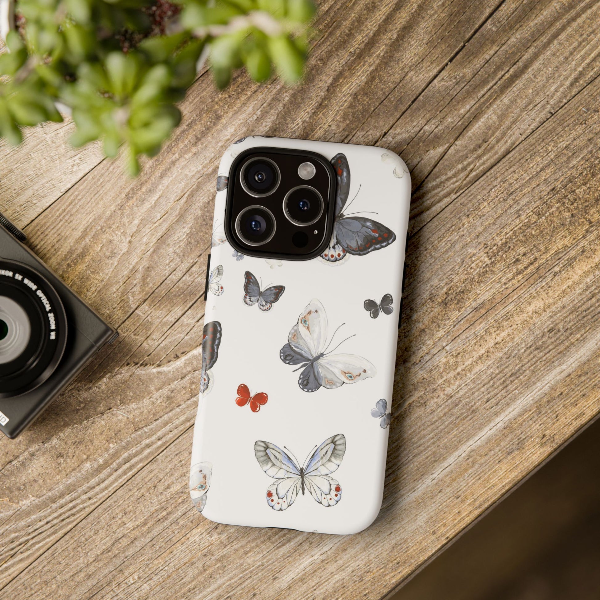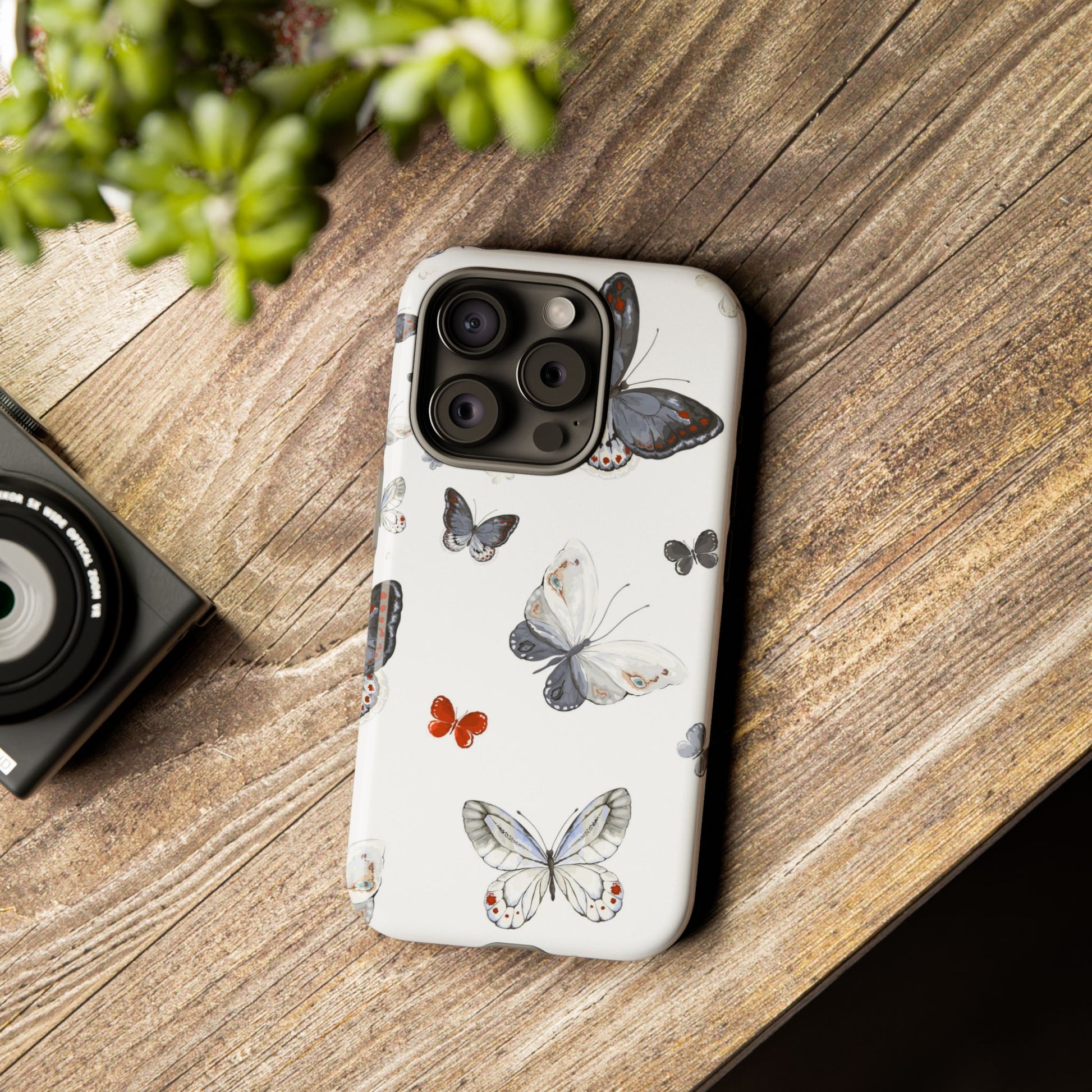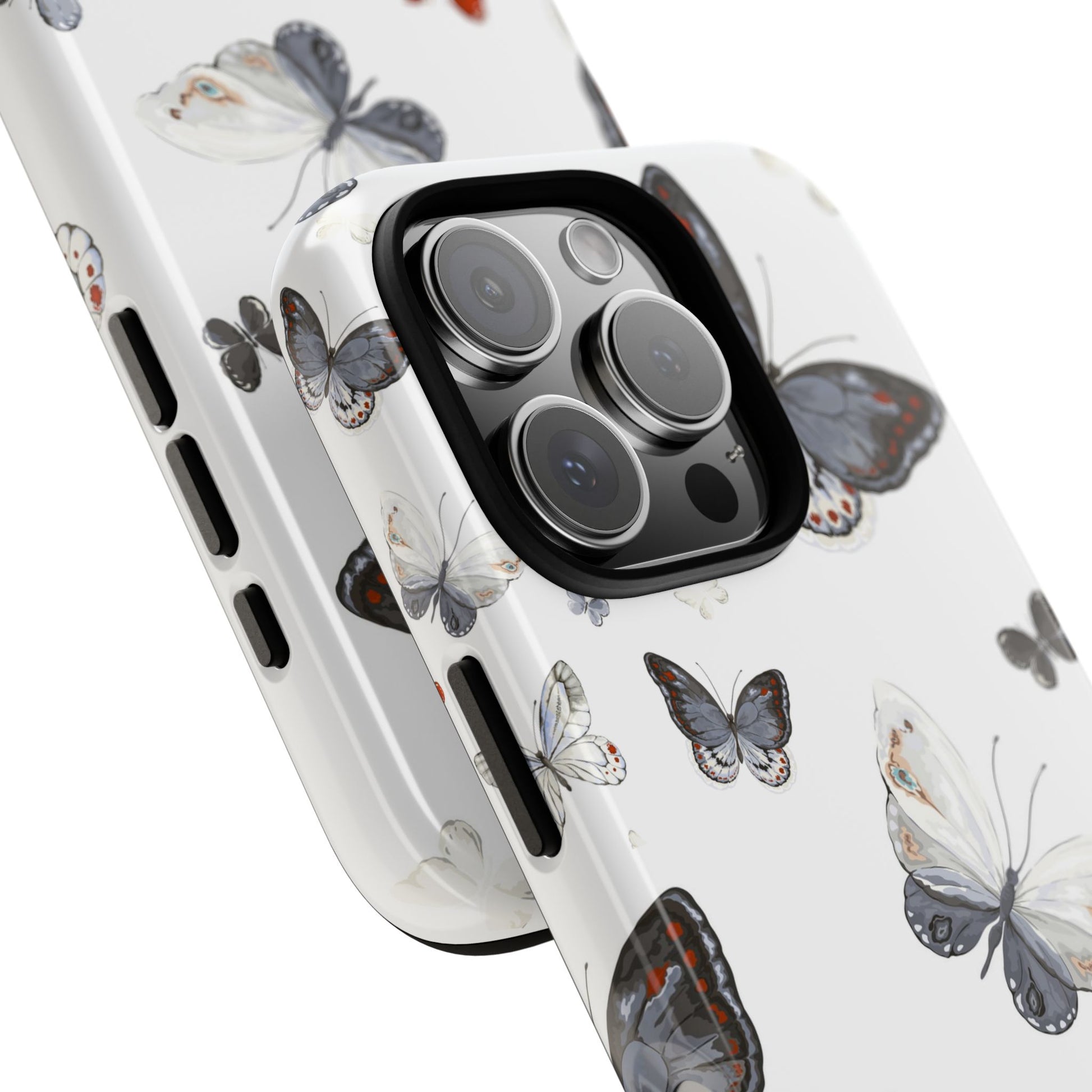 A slim, double-layer protective phone case printed with a delicate scattered-butterfly design. Soft grey, cream, and muted blue butterflies float across a clean white background while a single tiny orange butterfly adds a whisper of contrast. The outer shell is glossy (or matte) polycarbonate with a TPU silicone liner for shock absorption. The 3D wrap print flows around edges for a seamless look and UV-protection helps keep colors crisp outdoors. This case balances gentle, nature-inspired style with everyday impact resistance and clear port access — a quietly elegant way to keep a phone safe during daily adventures.