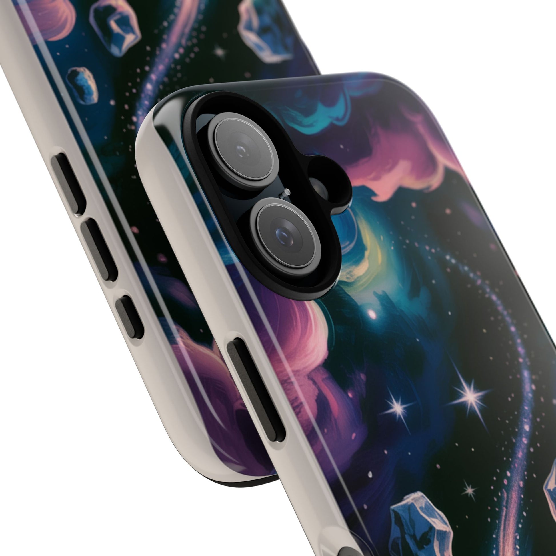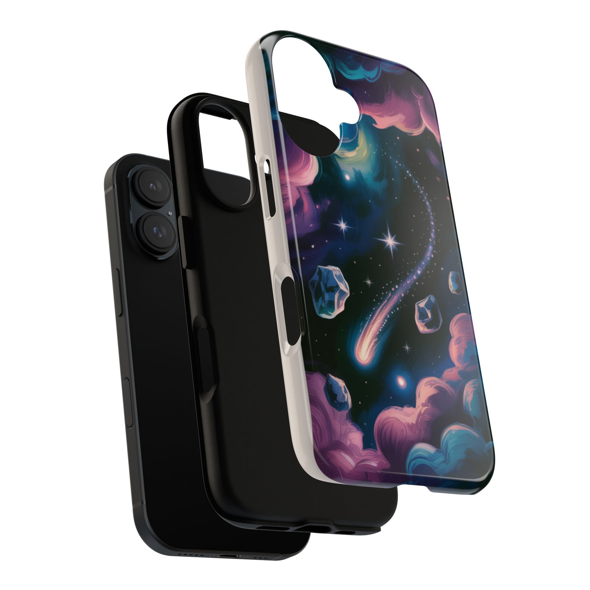 A slim, dual-layer protective phone case that wraps your device in a dreamy cosmic scene. Deep purples and teal blues swirl into soft clouds, while a shooting comet and floating asteroids add movement across a glossy or matte finish. The polycarbonate shell and TPU silicone liner combine for confident drop protection without bulk. Thoughtful cutouts keep ports open and wireless charging functional, and the high-density 3D wrap retains vivid color and detail over time thanks to UV protection and certified materials. This case brings a touch of stargazing wonder to everyday use — durable, tactile, and made to travel with you through city nights and quiet, sky‑watching moments.