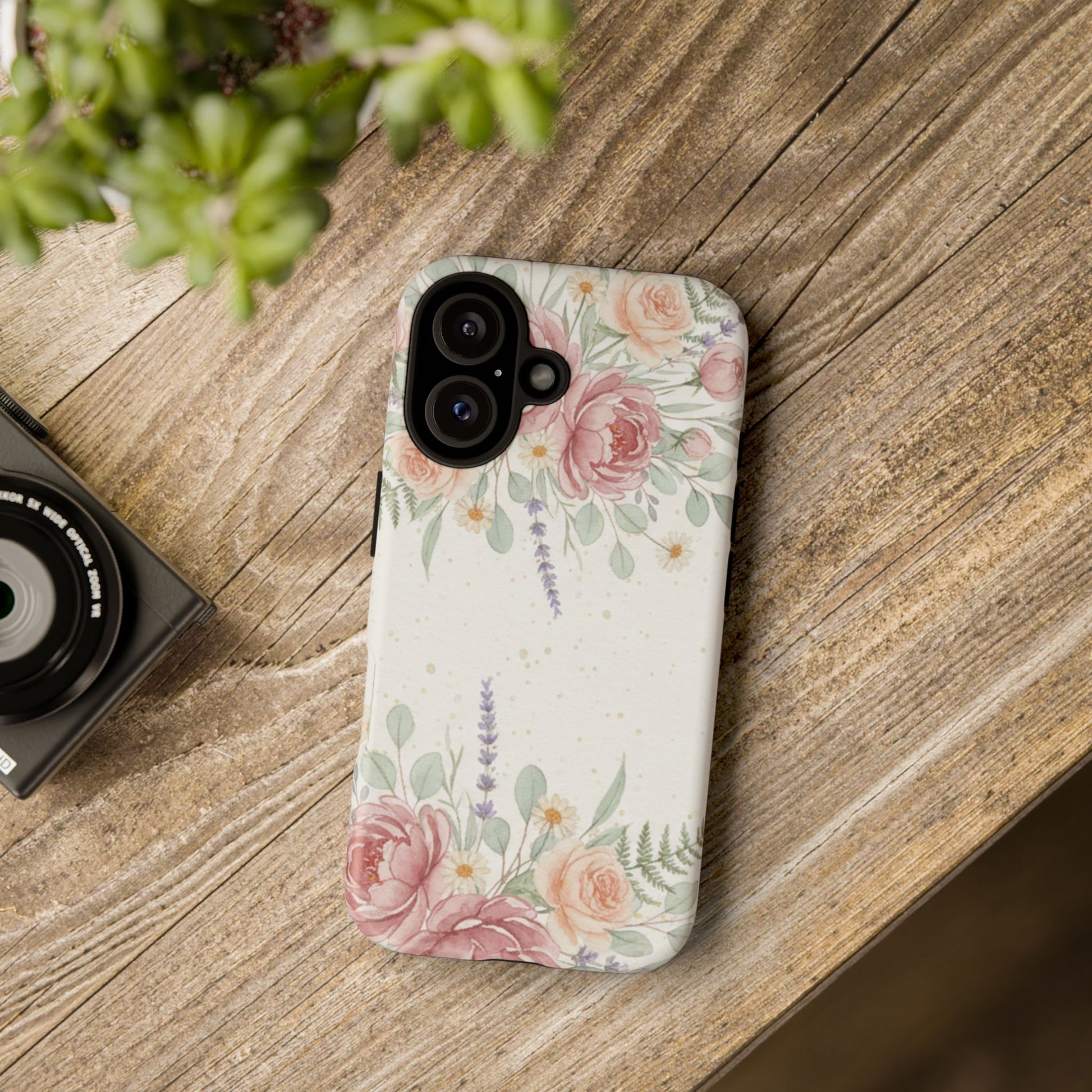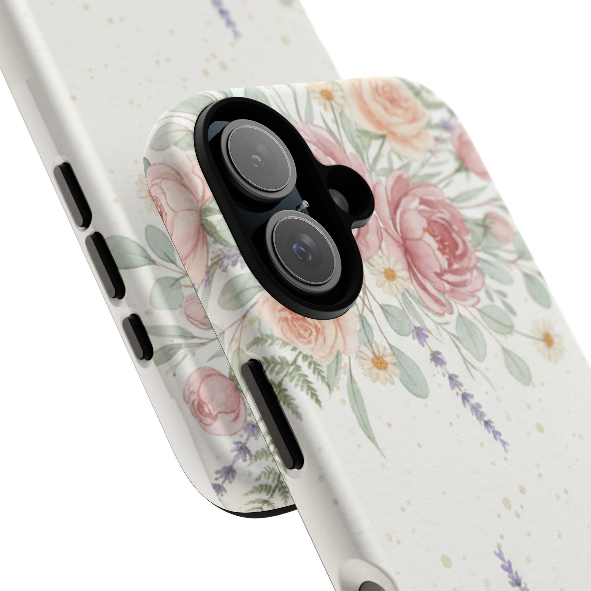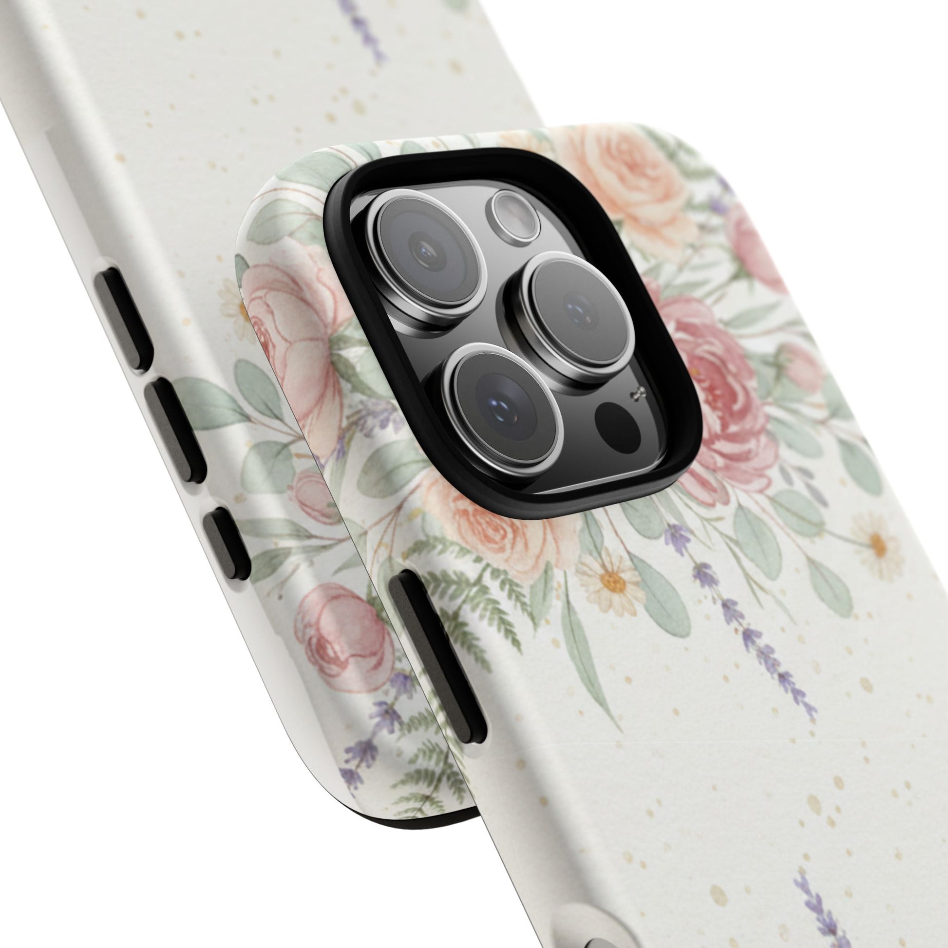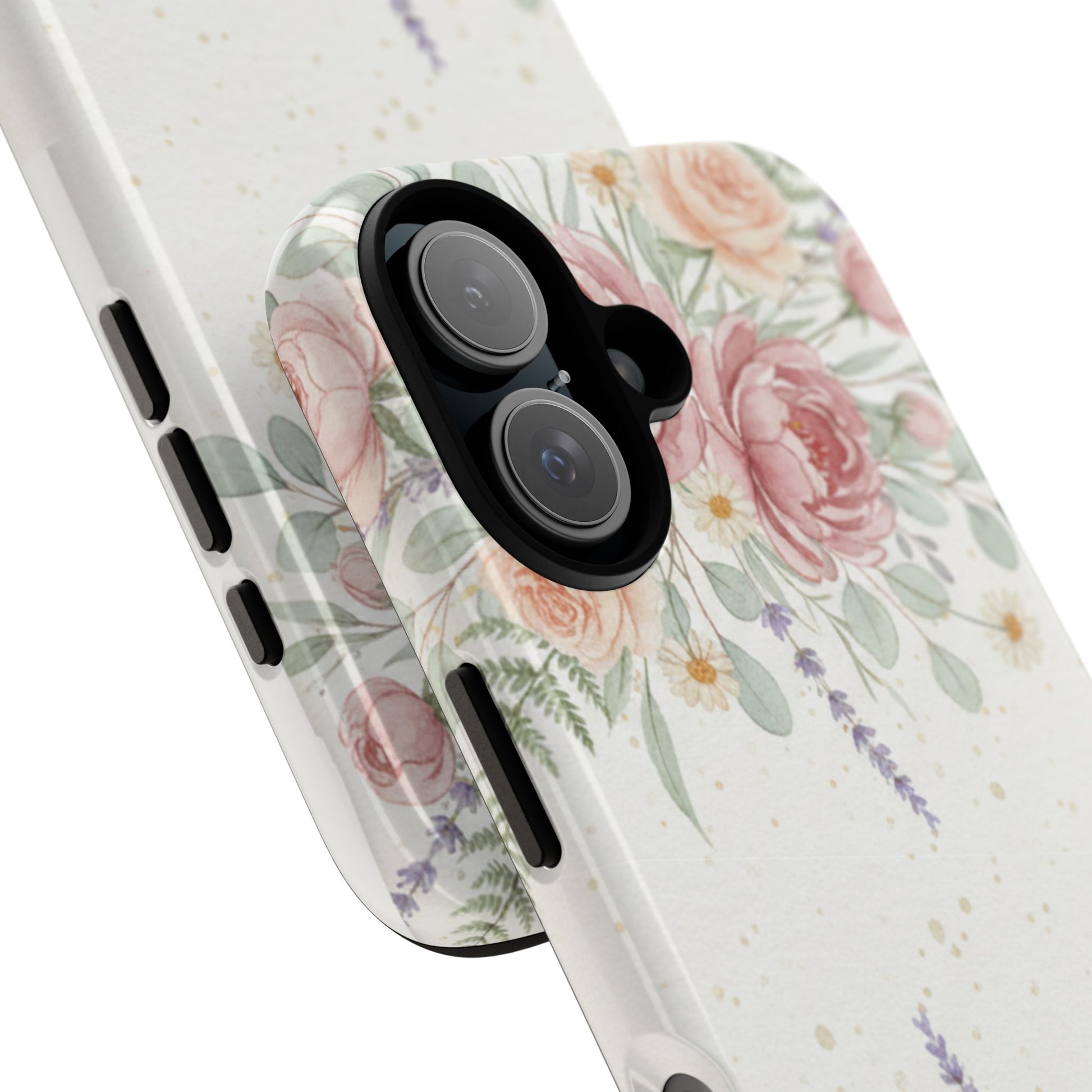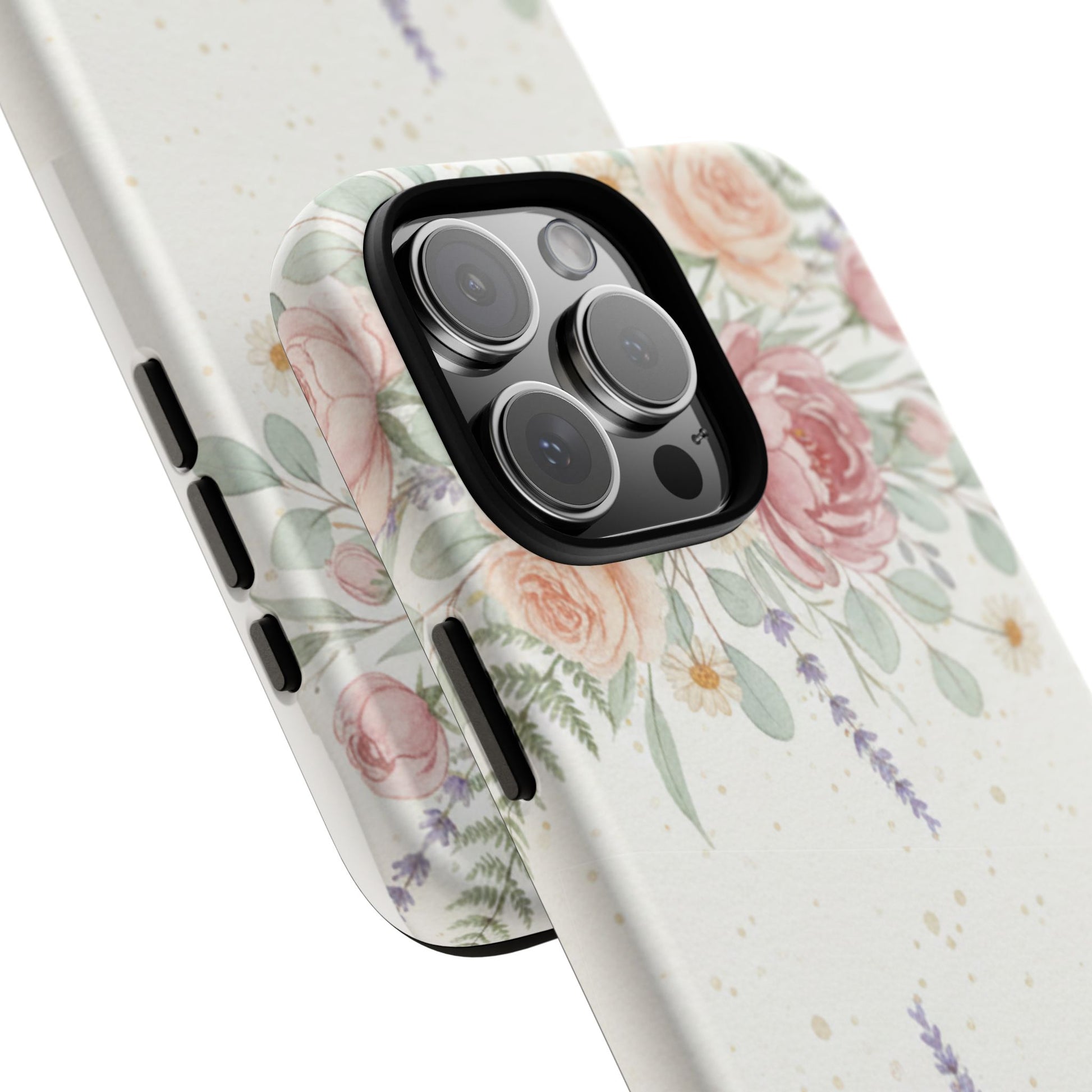 A slim, protective phone case finished with a soft watercolor floral print that feels both fresh and familiar. The design frames the camera with delicate roses, lavender sprigs, and eucalyptus leaves on a light, slightly speckled background — a calm, natural look that blends garden charm with everyday practicality. The case’s dual-layer build and silicone liner absorb shocks and resist drops while keeping access to ports and wireless charging. It wears like a tidy, wearable vignette of a quiet morning in a sunlit garden.