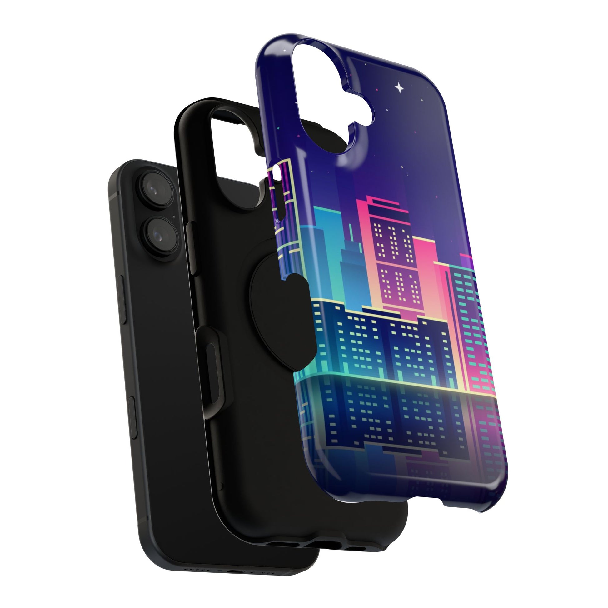 A sleek, impact-resistant phone case with a neon cityscape design that catches the eye and holds up to daily life. The glossy or matte finish brings out the saturated pinks, purples, and teal highlights of the skyline while the dual-layer construction — a rigid polycarbonate shell with a removable black TPU liner — absorbs shocks and resists scratches. The print wraps fully around the exterior for seamless color flow, and the case supports wireless charging so you can keep the look on and stay powered up. Lightweight but durable, it’s built for adults who love bold, retro-futuristic aesthetics and want dependable protection without sacrificing style.